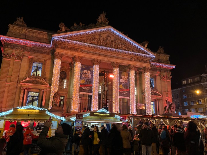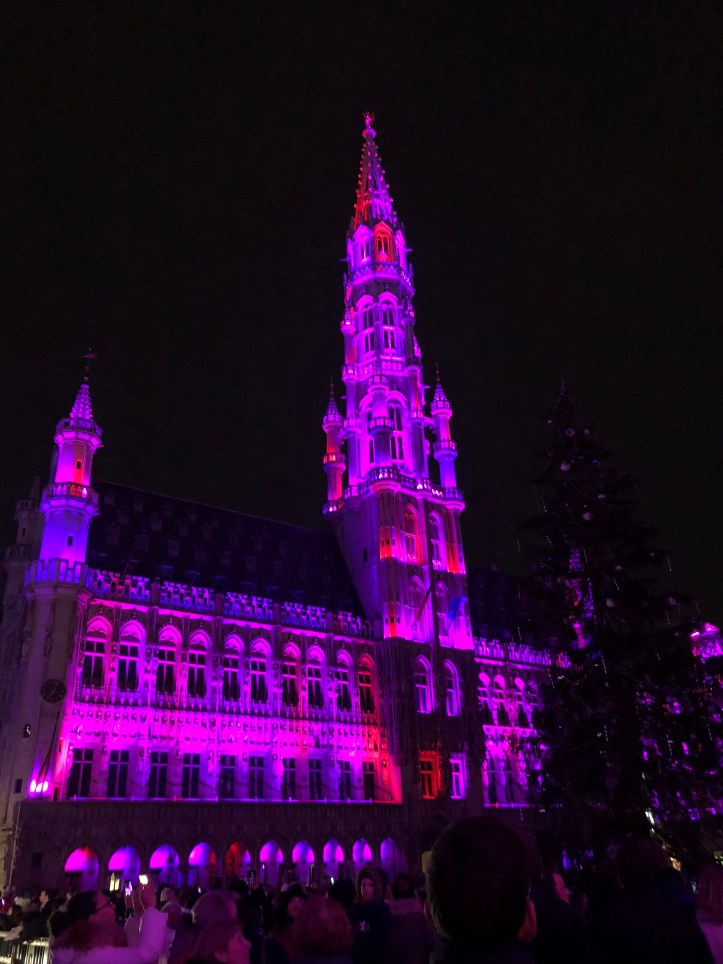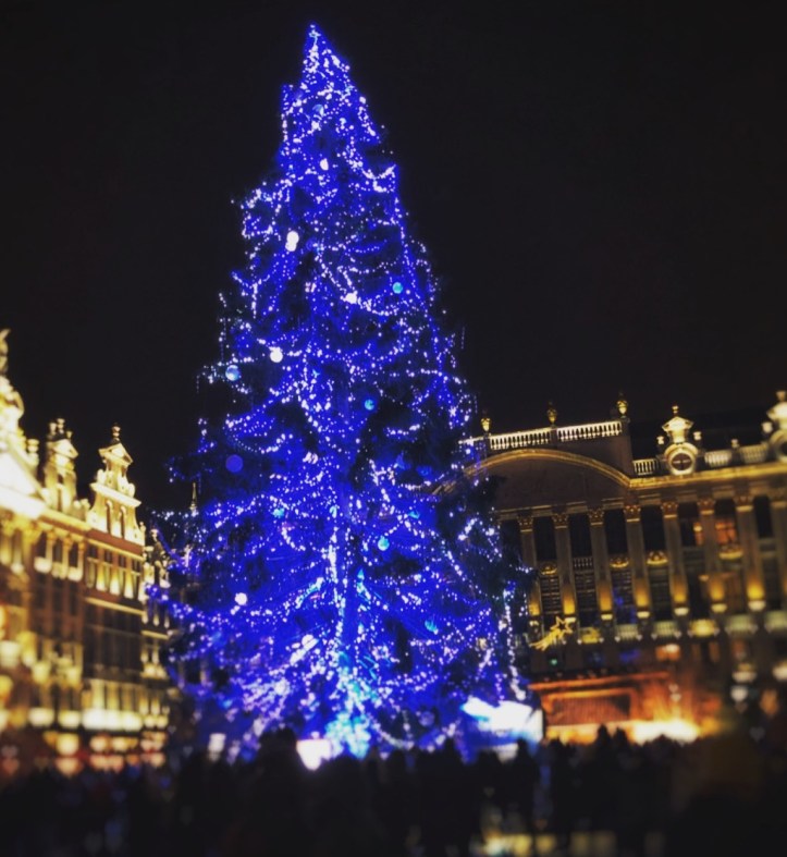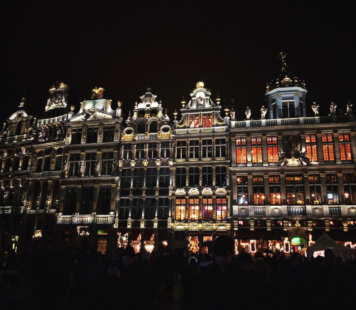 We chose our first stop as Brussels. Eurostar is part of interrail pass, but it requires a reservation of a seat, in order for you to use the pass.I reserved seats, on a morning train, leaving from St Pancras reaching Brussels Midi in the afternoon. We decided to reach St Pancras slightly early.It would give us time to have a leisurely breakfast at the station before boarding the train. It’s such a perfect way to start the holiday. There are plenty of options to eat at Kings Cross and St Pancras. I enjoy planning, chalking out the itinerary and details as much as I enjoy travelling. When I was a kid, I would plan days ahead, what books and comics I would carry to read on the train, my mother would diligently pack snack pots for the travel, which she would neatly pack in a little bamboo basket and I always had a special request for my snack pots. I always thought, the snacks tasted even more yummier in the train rather than at home. We reached Brussels by afternoon. We reserved a seat on a train for our next destination for the next day. Before heading out to our Hotel, we had lunch at the station, which consisted of a slice of pizza and some ice cream. The Hotel was right across the station. We checked in to our hotel, and had a lovely wintery afternoon Nap, nicely tucked in to a cosy duvet. Power nap, Beauty sleep, siesta whatever you want to call it, is claimed to be good for you, especially if one has been working a bit of crazy hours and is slightly sleep deprived. By the time we woke up, it was drizzling, the roads were glistening in the rain and all the holiday lights were on. We gulped down a hot cup of coffee at the Hotel, wrapped ourselves in scarves, woolly hats and coats and walked out with a warm happy wintery glow on our face towards the Grand Palace. During the month of December, the Grand palace has a sound and light show at frequent intervals in the evenings. It’s a spectacle not to be missed, the Square comes alive with music and lights. Although I thought the music could have been a bit more cheerful. The Square itself dazzles with a large pine tree lit up, with buildings and shops around decorated in tinsels and lights. There are many more Christmas markets around the city, but we stayed in the Grand Palace area. We walked around a bit more around Grand Palace, later on had a hearty meal at one of the restaurants, then walked back to our hotel, by this time it was freezing cold and the rain was turning in to sleet.