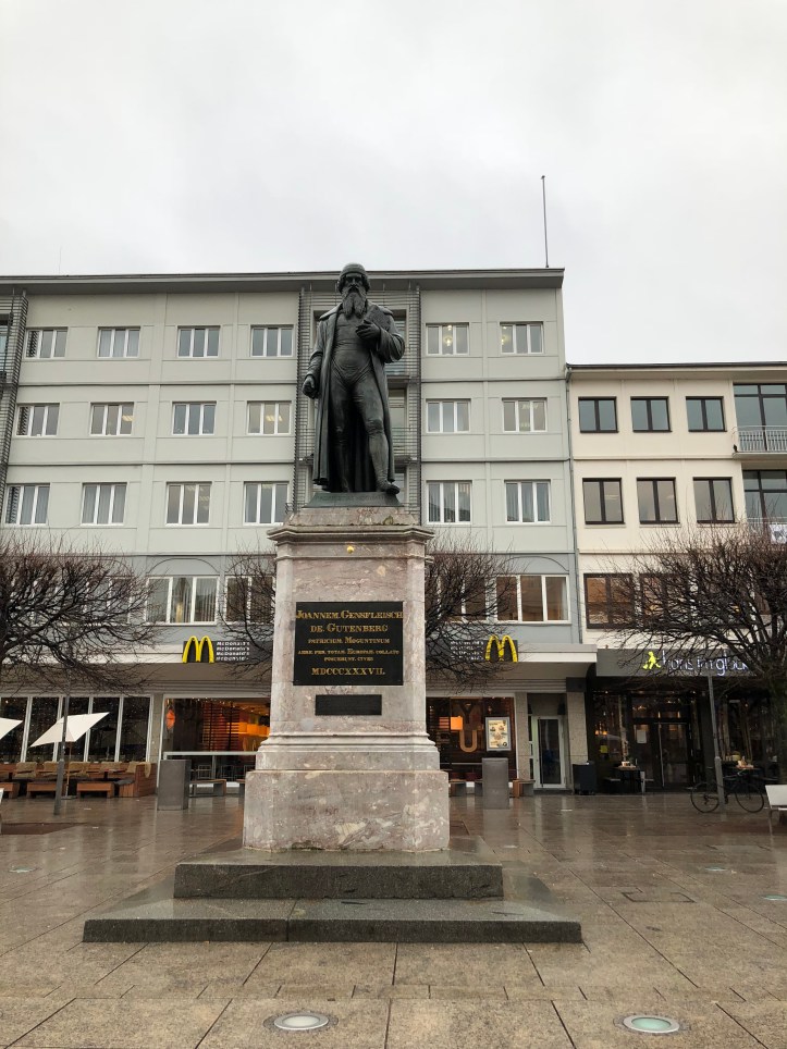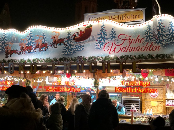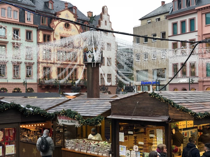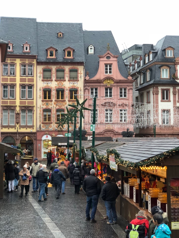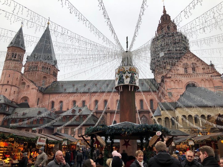 The next day morning we had a scrumptious breakfast at Hotel, before heading out to the main Station. We wanted to visit Mainz, a historic town known for its medieval city centre and Gutenberg Printing press. I looked up the train timings on Interrailapp, and found out we did not require reservation for this travel. It’s situated at an half an hour journey by train from Frankfurt. Mainz is a city in the Rhineland, situated on banks River Rhine, where River Main meets River Rhine. Mainz Old town /Aldstadt is very pretty, with half timbered and coloured medieval houses and is even more attractive with Christmas lights, and markets. There is plenty to eat and drink. My personal favourite during this trip was Fruchtspieße or Fruit skewers. It is fresh fruits covered in chocolate on a skewer. There a wide variety of fruits, from Cherries, strawberries, grapes to pears and apples too. There are candied version of fruits too, but my personal favourite is with fresh fruits. It’s perfect to walk around munching on the chocolate covered juicy fruit or standing near a open fire bowl to get a bit warmth and give your feet a rest from the walking. We also visited the Mainz Cathedral, which is situated in the old market, and is not far from the Christmas market. The Cathedral referred as Dom , a red coloured building stands tall and is a beautiful backdrop to the market. It is very difficult not to want to wander towards it and walk in. The Dom is thousand years old, is made of sand stone, a Romansque style, with lots of statues and paintings , it is a bit dark inside, but nevertheless very beautiful. I would have loved to know more about it, but there was no literature inside the Church. I would recommend visiting the Church, if you are in Mainz.