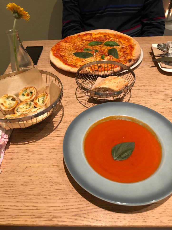 We stopped over for lunch at a place called Aposto, opposite to the the statute of Gutenberg , the man who started the Gutenberg press. It was also to give a rest to our aching limbs and to get the contact lenses out of my dry eyes to switch to comfort of glasses. The food was warm and delicious, the ambience was lovely, and staff welcoming. I had a tomato soup and garlic cheese rolls and my husband ordered a pizza. The pizza I must say was large, and I was glad I ordered a warm soup. After the lunch we were wondering where to head next, we decided on another city of Rhineland, which we visited on our earlier trip, and loved it. We boarded on a train from Mainz to Cologne.
