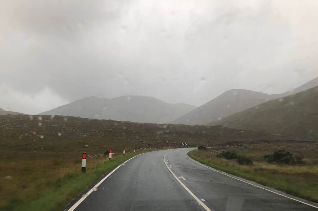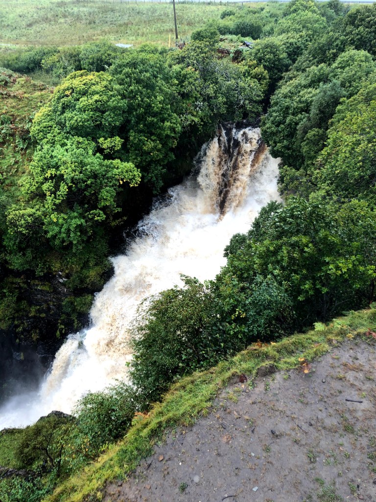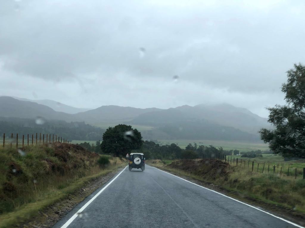 The next morning after a warm breakfast, we started the next leg of journey it was a crisp sunny September morning. The skies were azure blue with a bit of light fluffy clouds when we drove past the blue Scottish flags fluttering and welcoming us. The weather started to change as we drove along, grey clouds started covering the sky and it started to rain. It rained all the way to Isle of Skye and it was raining most of the time when we were in Scotland. I have always loved rains, the wonderful pitter-patter of raindrops, the rhythmic gush of the rain falling on the the ground, and the smell of rain is a joy, as it awakens the senses, washing away all the burdens and worries with it. Have you ever walked in the pouring rain, without a care in the world ? I have been told off many a times as a child for getting outdoors in pouring, but I love being drenched in the rains. And during this trip, I got soaked up in the rain to my heart s content. Scotland drenched in rain and mist looks elemental and moody. The rugged mountains covered with autumn Heather looked ravishingly beautiful and equally broody. The gushing waterfalls in the mountains, plunging down with a thunderous roar were adding to its phenomenal charm. We reached Portree early in the evening, drenched in rain from head to toe, having stopped on several locations to take in the beauty and just stand in the rain, listening to the pitter patter of rain and the whirling mountain breeze. It rejuvenated us completely, nature with its compelling power has an ability to revive a tired body and soul very gently.