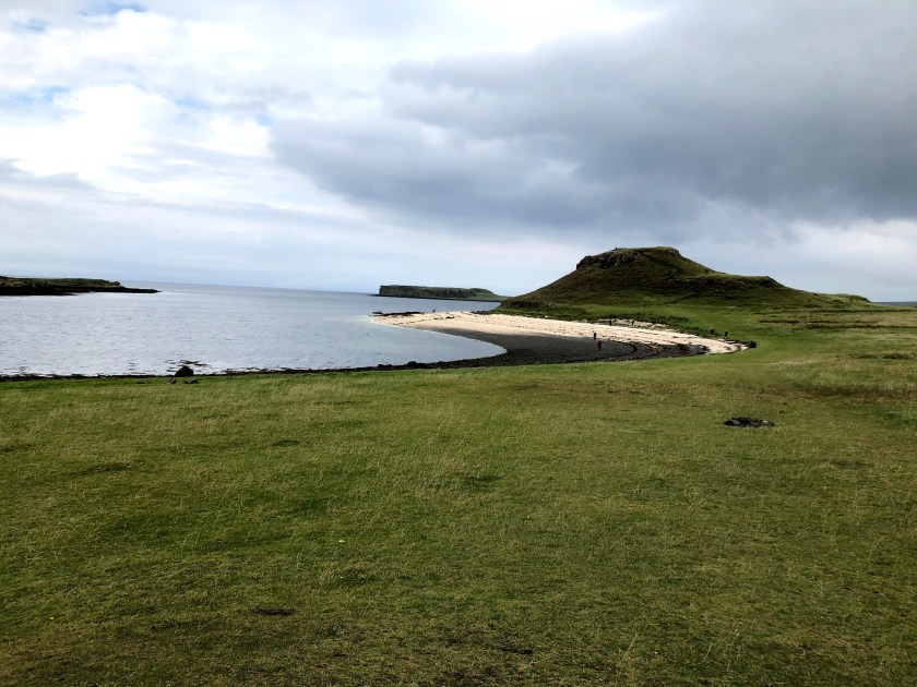 Another beautiful spot is the Claigan coral beach in Dunvegan. We drove in to Dunvegan around mid morning, after a lovely lunch at a cafe , before heading towards the beach. The beach is a around 25 to 30 minutes walk from the car break. The dazzling white ‘sand’ of Claigan Coral Beach, is visible as you cross the green pastures towards the beach. The white sand is not sand but deposit of small pieces of ‘coralline’ hard seaweed called maerl that is crushed by wave action, dried and sun bleached on the shore. The beach was very quiet, and it was wonderful to listen to the waves gently lapping on to the shores.